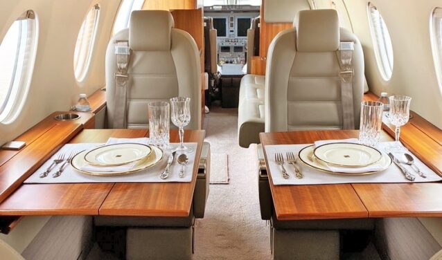 Der Privatjet bietet Platz für 6 bis 7 Passagiere. Die Sitzkonfiguration umfasst Clubs für vier Passagiere sowie eine Couch für drei Personen.