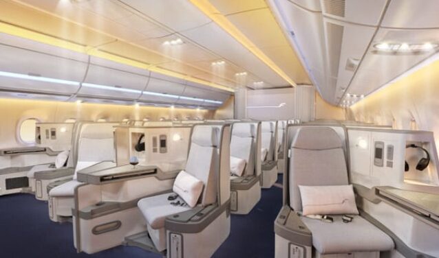Der Airbus A350-1000 hat in der Konfiguration mit 3 Klassen eine Kapazität von 350 bis 410 Passagieren. Seine Kabine mit zwei Gängen ist die geräuschärmste am Markt. Die Sitze sind breit und die LED-Umgebungsbeleuchtung minimiert die Auswirkungen des Jetlags.