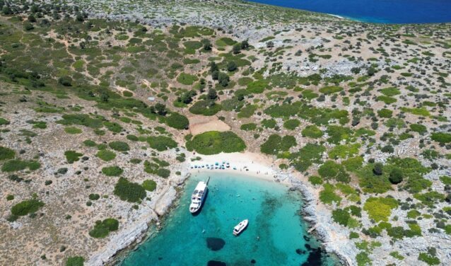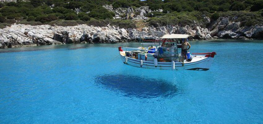 Sie können auch ein Boot mieten, um die Insel und ihre Umgebung zu erkunden: Halten Sie am Strand von Kalamitsa, einem der schönsten Strände der Insel, mit durchscheinendem Wasser.